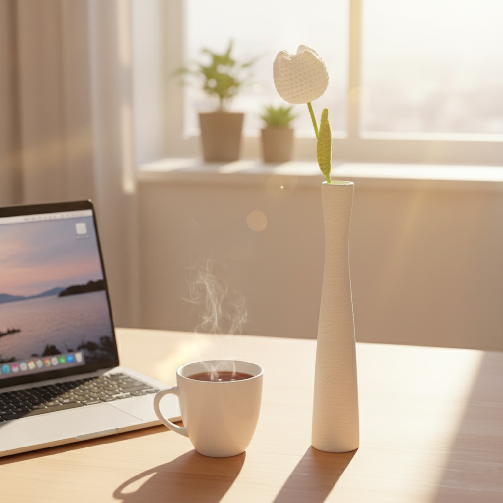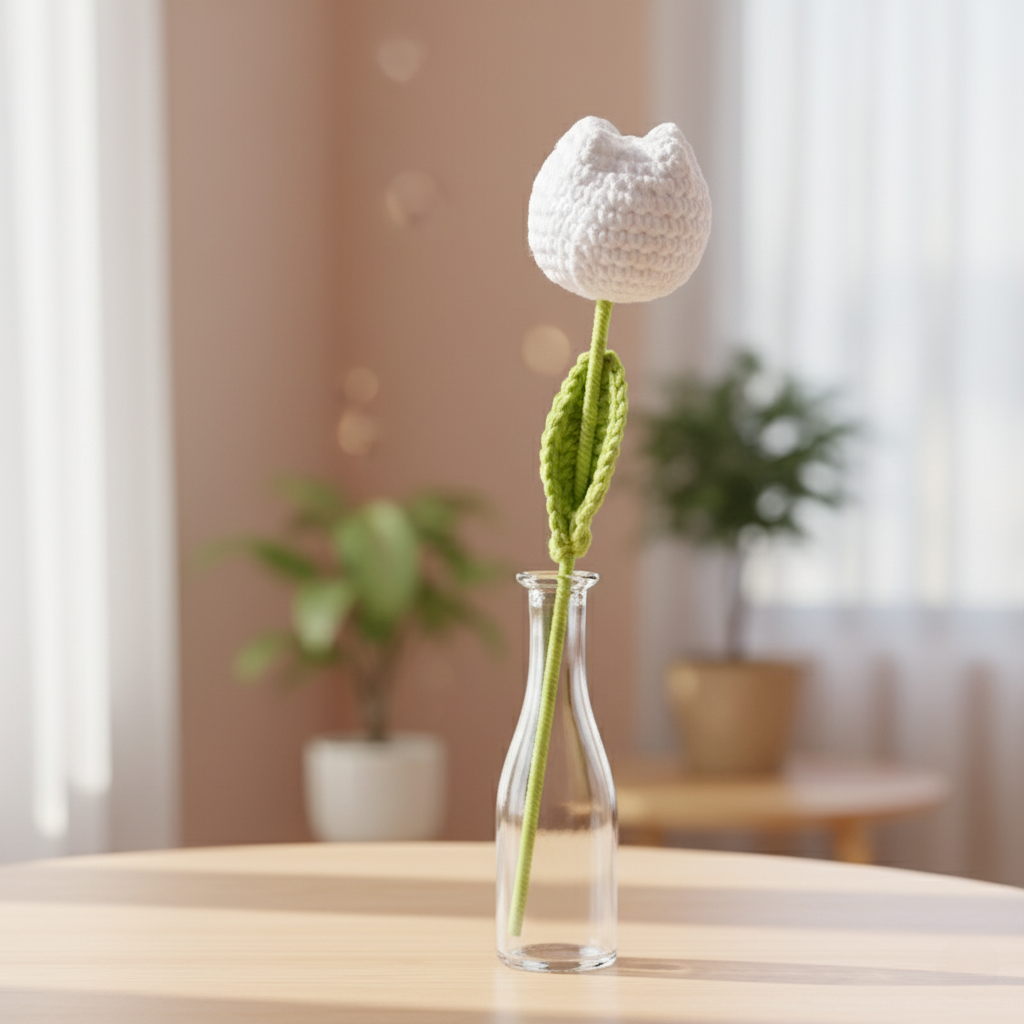Breng een vleugje rust en elegantie in elke ruimte met onze handgemaakte White Dream Crochet Tulip Flower . 🌿 Elke tulp is liefdevol gehaakt met zacht, hoogwaardig garen en symboliseert puurheid, eenvoud en eeuwige schoonheid. Perfect als losse steel voor op je bureau of als onderdeel van een sereen boeket voor thuis.