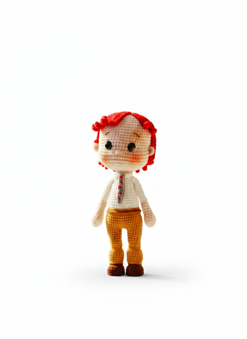 Jasper is een nieuwsgierige kleine gehaakte pop met een hart vol verwondering! Met zijn felrode haar, rode wangen en grote, bedachtzame ogen staat hij altijd klaar om iets nieuws te ontdekken. Keurig gekleed in zijn crèmekleurige overhemd, warme mosterdgele broek en een netjes gestikte stropdas, ziet Jasper eruit als een echte jonge avonturier met een vleugje charme.
