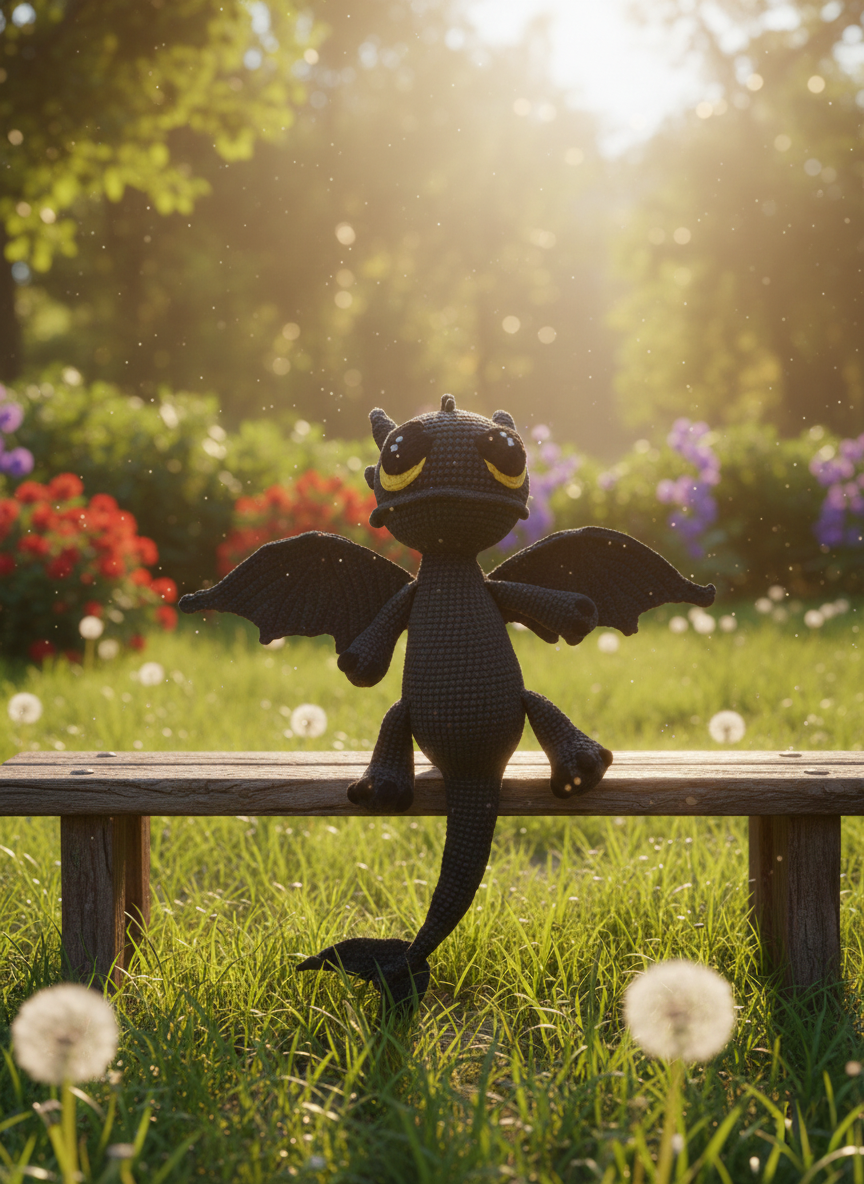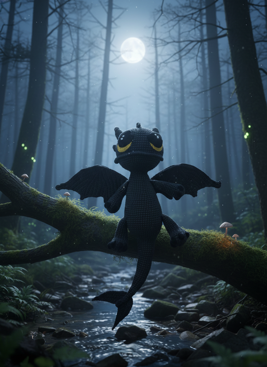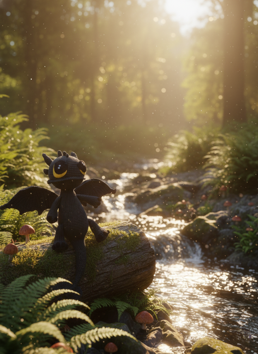 Maak kennis met Onyxie , een kleine nachtelijke draak met gloeiende gouden ogen en de zachtste vleugeltjes. Handgehaakt met donkergrijs garen, draagt hij de charme van maanverlichte bossen en warme verhaaltjes voor het slapengaan met zich mee. Met zijn zachte uitdrukking en speelse staart brengt Onyxie moed, troost en een vleugje magie aan elk kind dat hem vasthoudt.