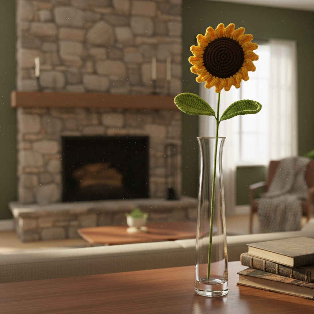 Deze gehaakte zonnebloem voegt een vleugje handgemaakte charme en vrolijkheid toe aan elke ruimte, of u hem nu in een vaas zet, individueel cadeau geeft of in een boeket rangschikt.