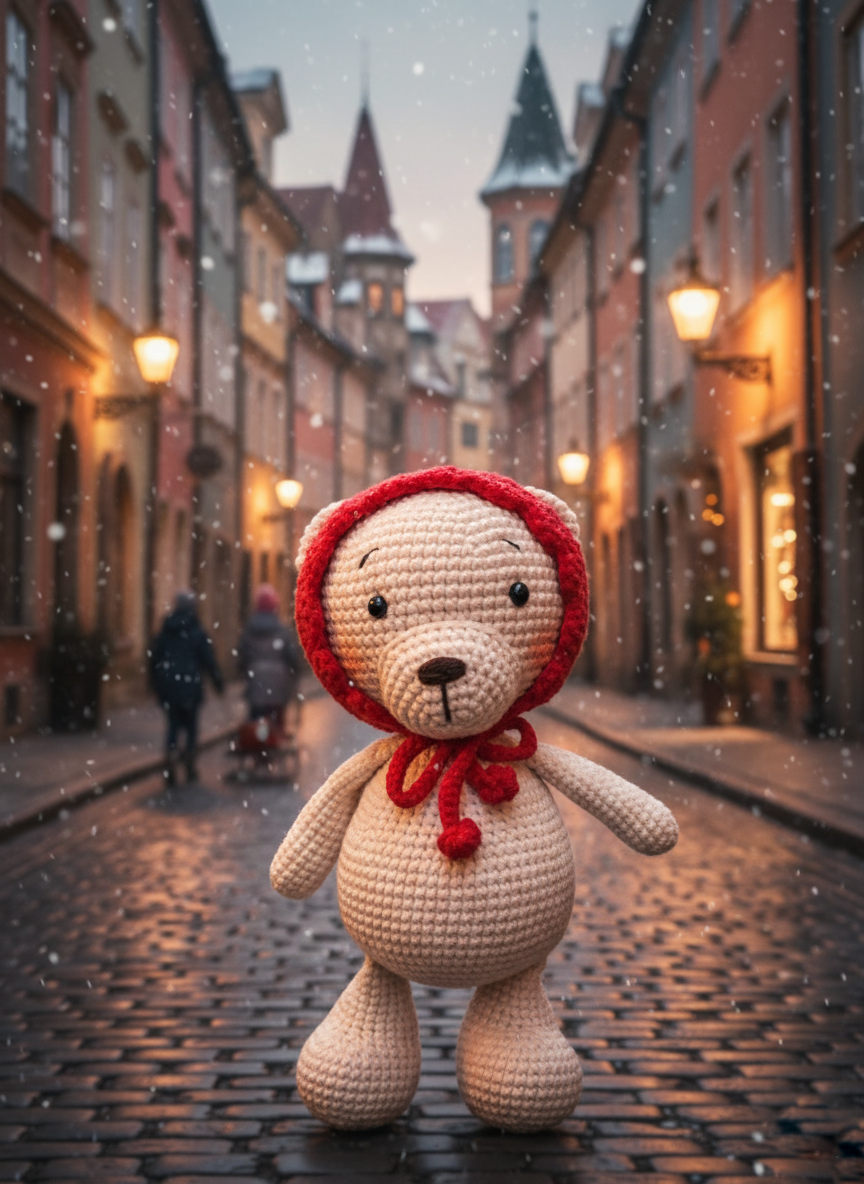 In een wonderlijke wereld van bossen en sprookjes leeft een kleine beer genaamd Rose. Met een charmante rode muts met een lieflijke strik lijkt ze klaar voor elk avontuur – of het nu een wandeling door een zonovergoten bos is of een wandeling over een knus, besneeuwd laantje.
