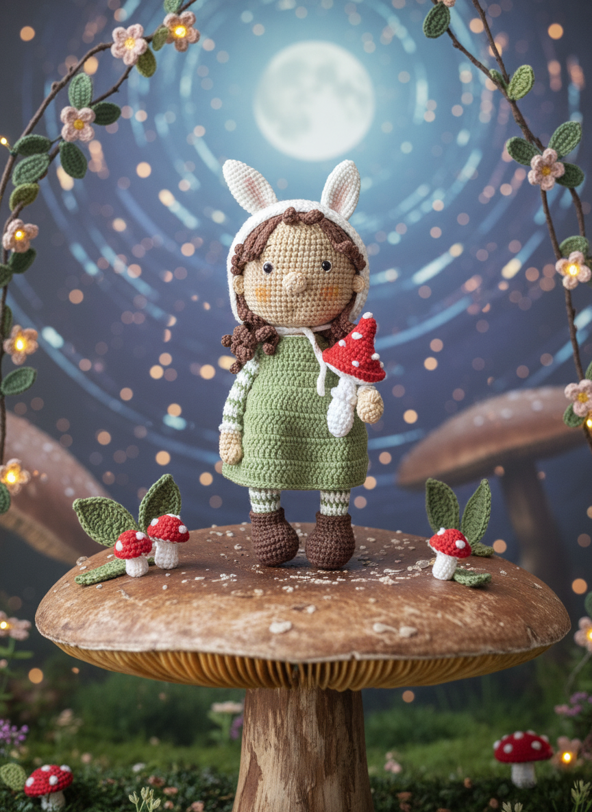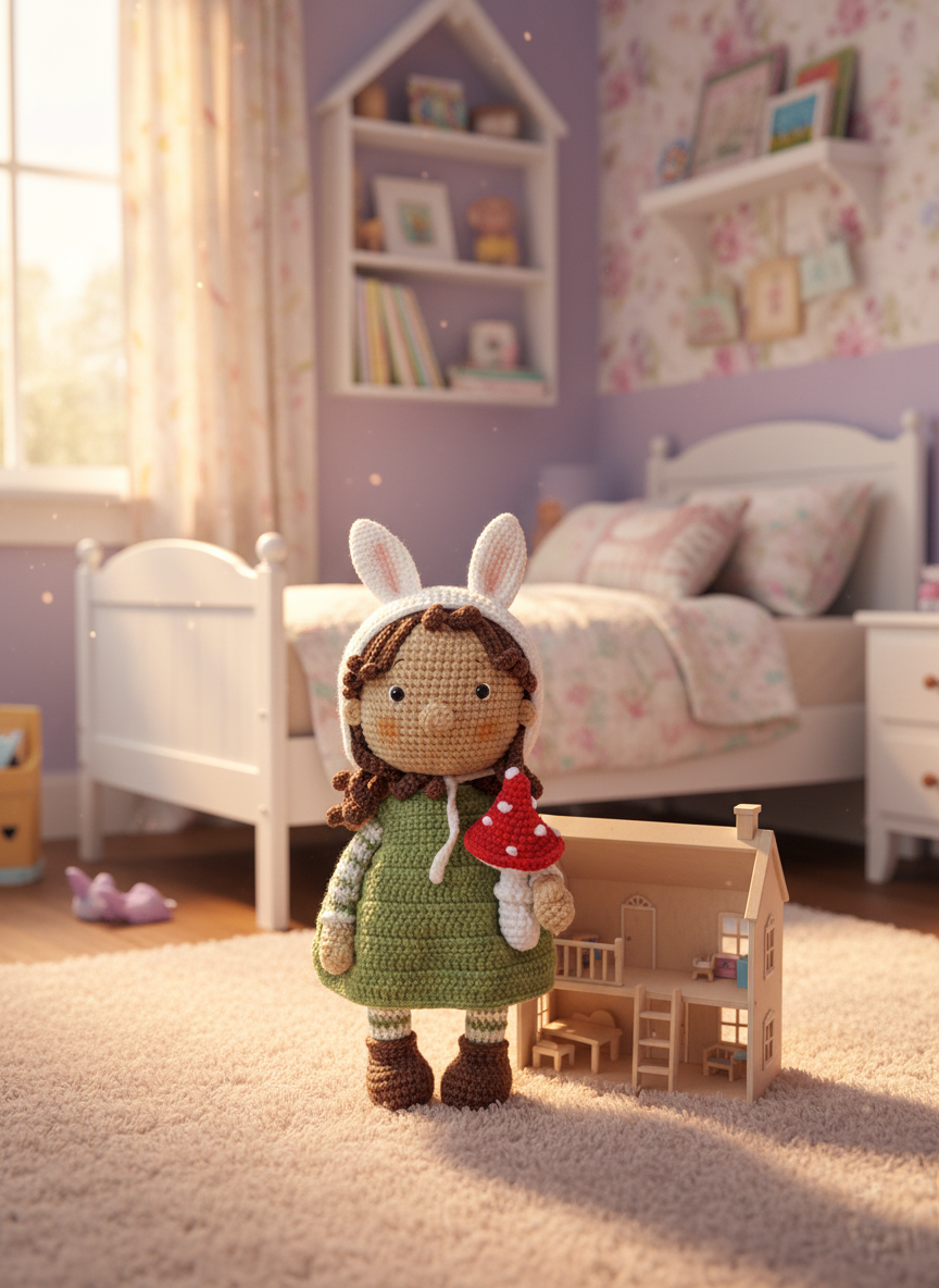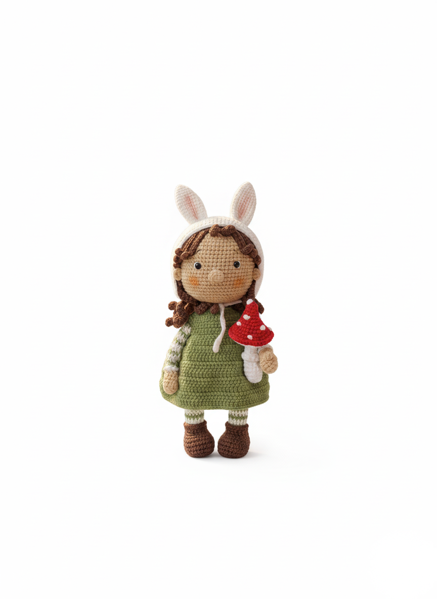 Meet Fawnie, a sweet little wanderer from the heart of the forest. With her cozy green dress, soft bunny-ear hood, and tiny red mushroom in hand, she brings the magic of nature wherever she goes. Her gentle smile and warm, curious expression make her an instant companion for imaginative play and quiet cuddles.