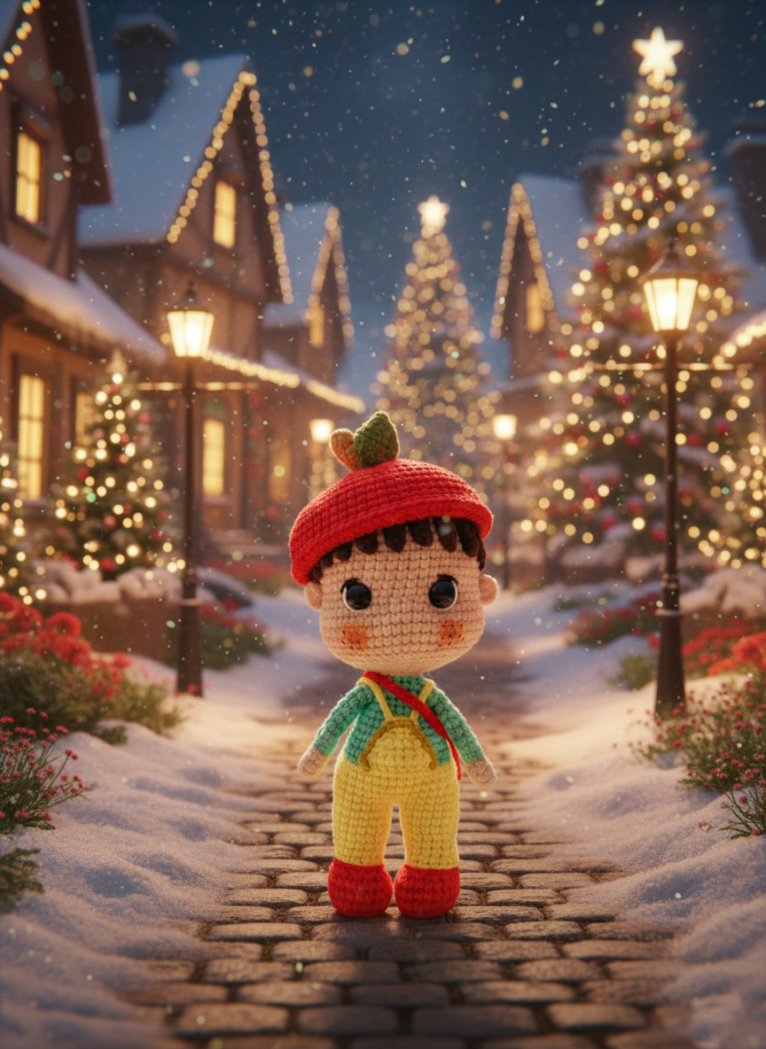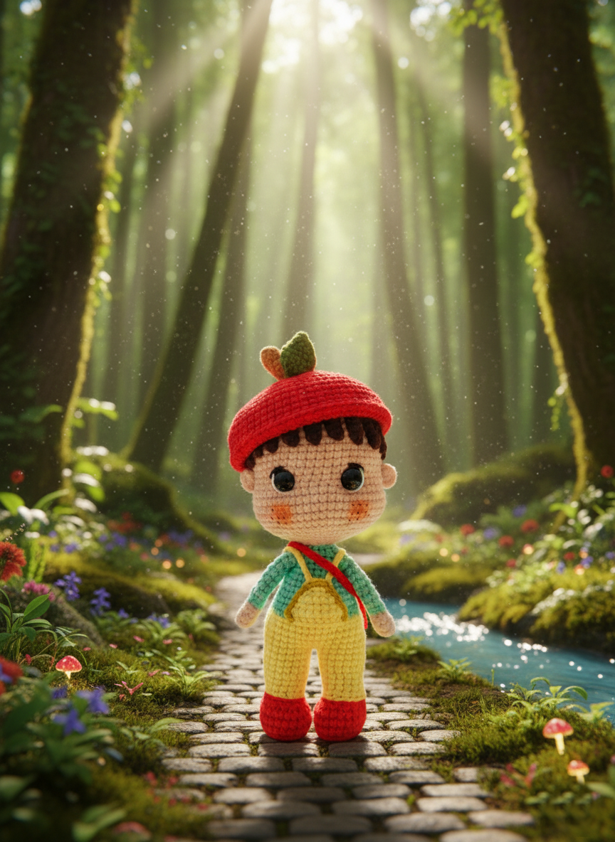 Peach is a cheerful little crochet doll who brings sunshine wherever he goes! With his soft brown hair, rosy cheeks, and a cozy red hat topped with a tiny leaf, he looks like he just stepped out of a storybook garden. His mint-green sweater and yellow overalls make him the picture of playful charm, while his red shoes are ready for any adventure that comes his way.