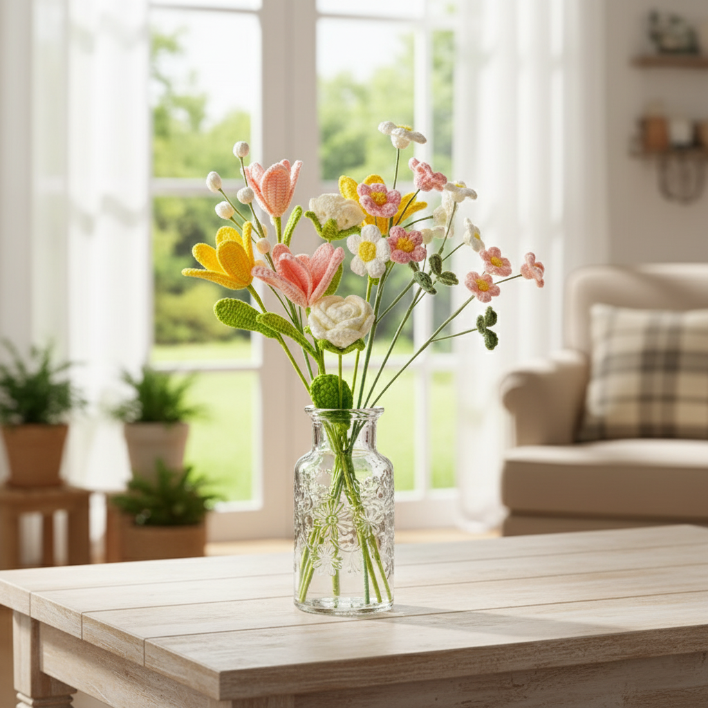 This 6-piece crochet flower bouquet is a joyful mix of tulips, snowberries, clover, and delicate blossoms, carefully crafted in soft pastel shades of pink, yellow, and white. Each flower is knitted with love, capturing the beauty of spring in a lasting keepsake.